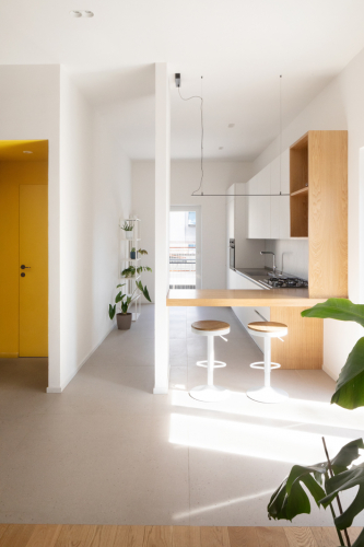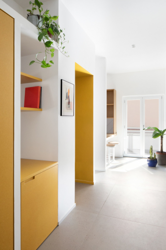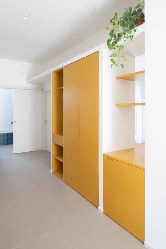 La ristrutturazione della casa, che si sviluppa su una superficie di circa 120 mq con un terrazzo a livello di circa 50, è affidata ad una sorta di “spina” centrale, che razionalizza la distribuzione dei diversi ambienti domestici. La scelta e organizzazione dei materiali della casa ne chiariscono la logica distributiva e gli arredi realizzati su misura in mdf giallo raccontano le sue diverse funzioni.